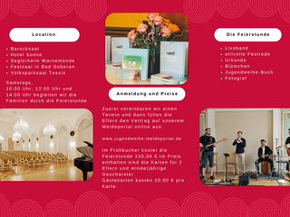 - die Plätze für Eltern/ Geschwister bis 18 J. sowie zusätzliche Gäste sind bei Anmeldung anzugeben